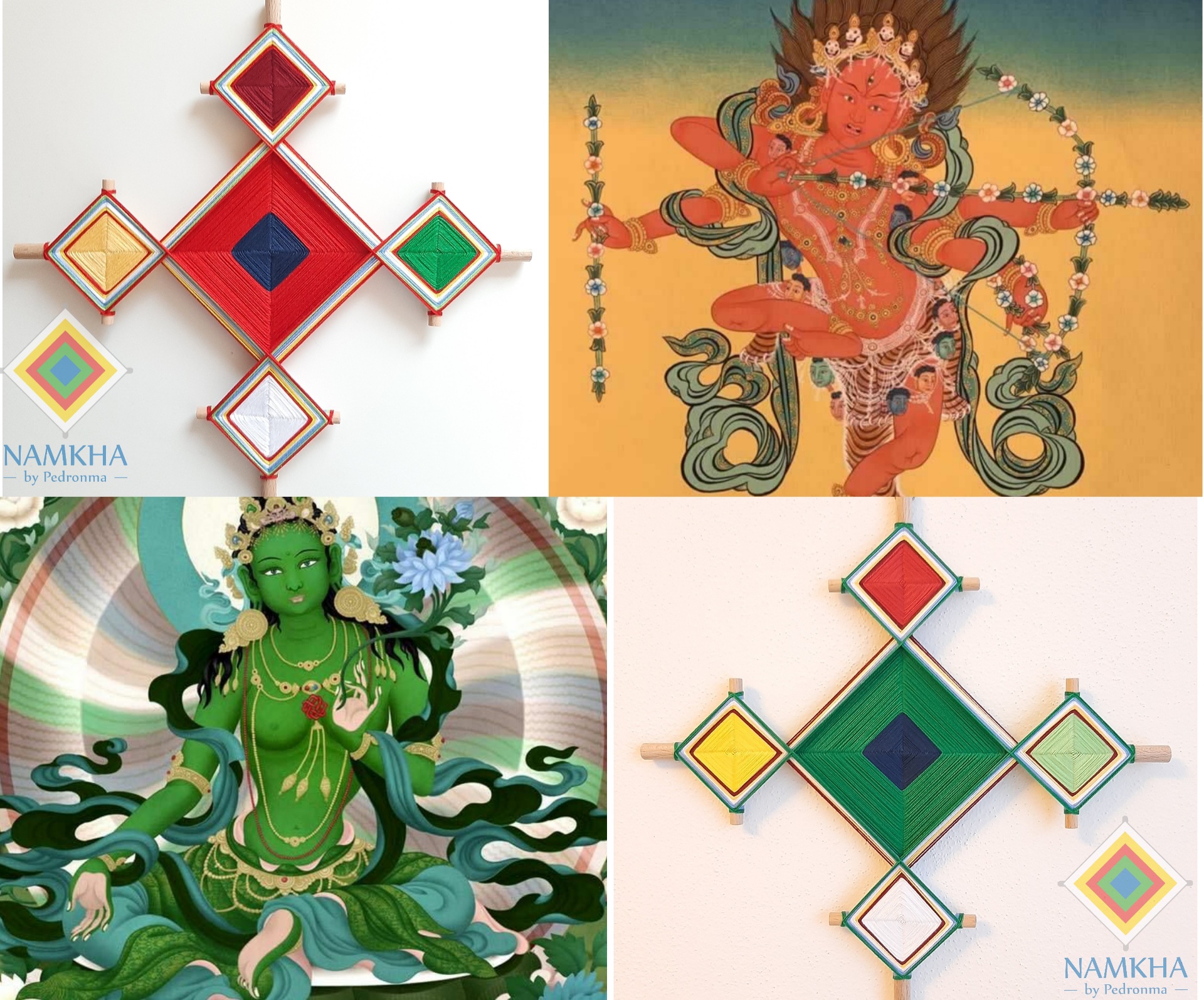Namkha can be constructed to represent a Buddha or a Deity in the same way as a painting or a statue. Any deity can be represented by a namkha. I make namkhas of deities I have received initiation for and practice. They are empowered by the Namkha practice and the deity saddhana and mantra. Contact me for availability. The most popular deity namkhas have been Medicine Buddha (Sangye Menla), Green Tara (Drolma), and Kurukulla (Rigjema).