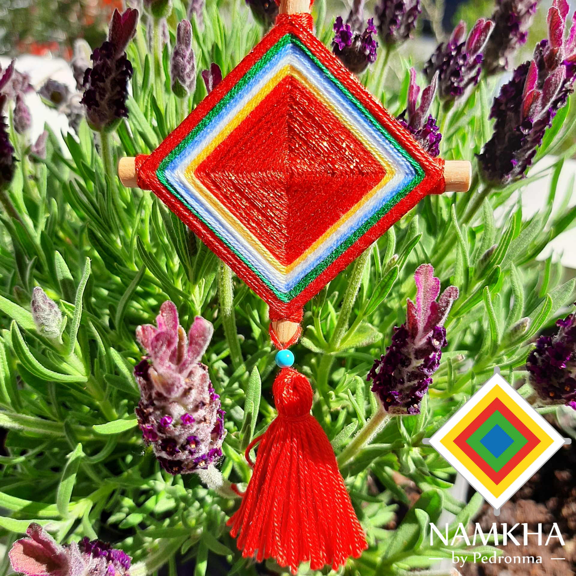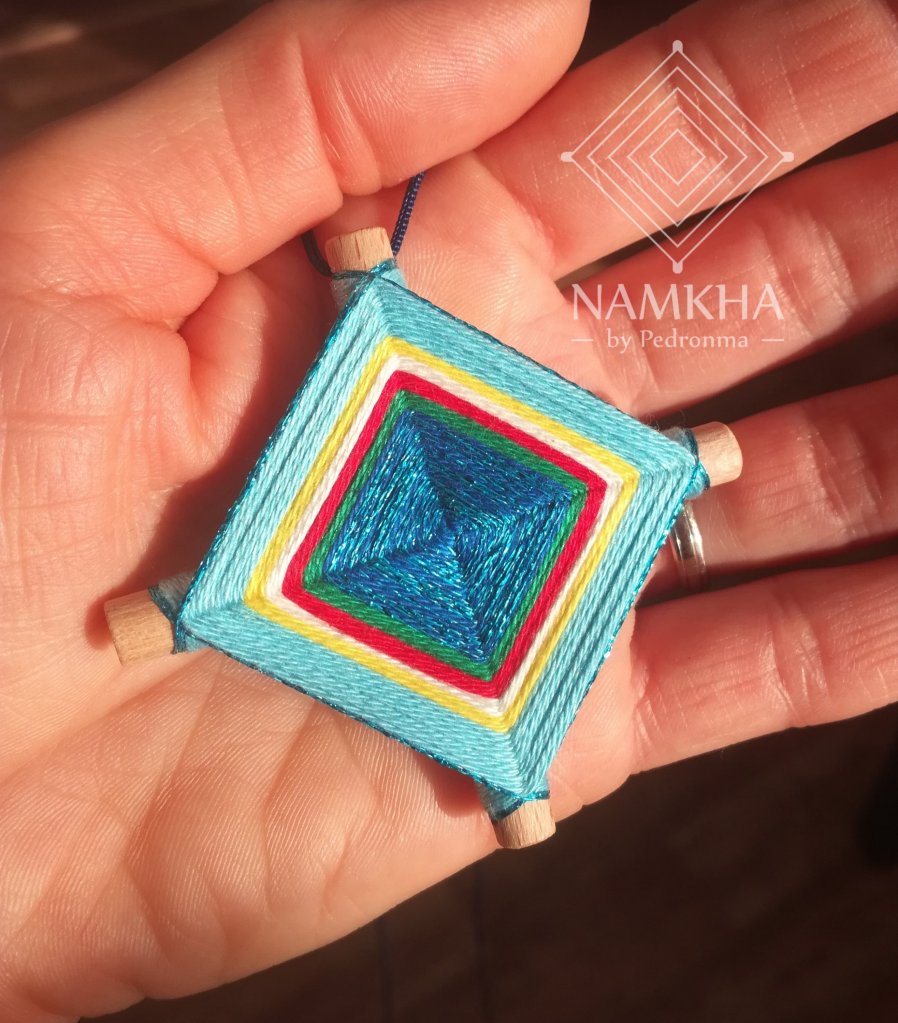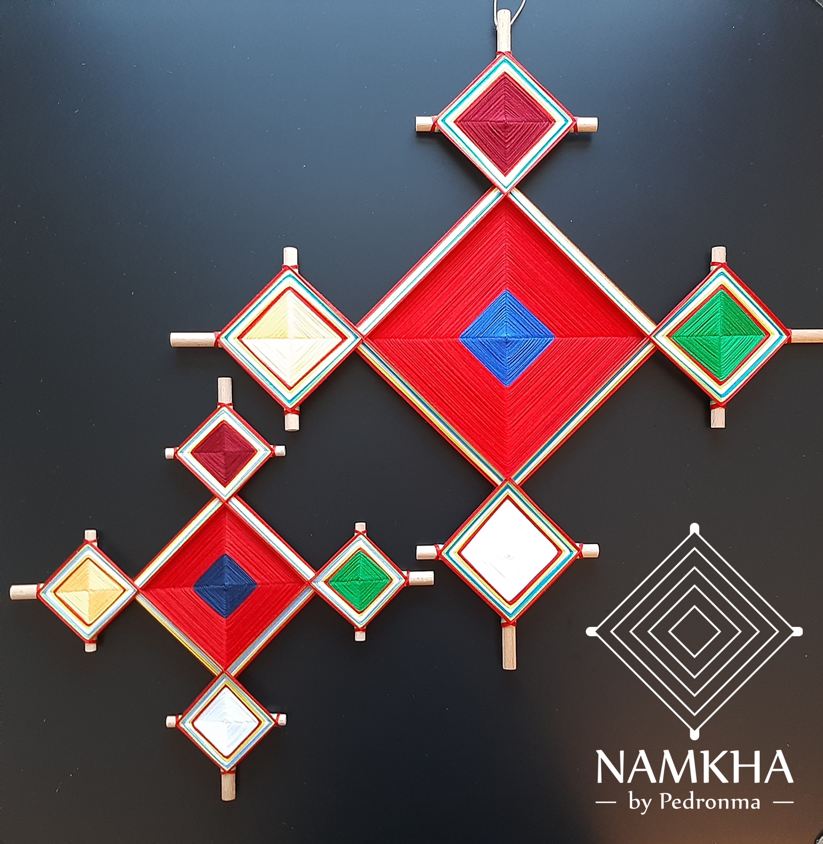 Namkha is of a 35cm or 50cm variety, made with quality round beechwood sticks and thin quality cotton yarn of 5 colours. No glue is used, the force of the weave keeps the frame intact. It is rather delicate and meant as a shrine or decoration object.
